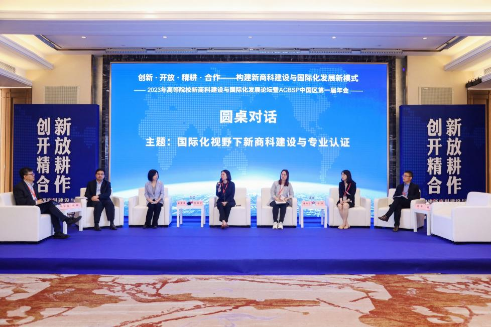本次论坛还围绕“国际化视野下新商科建设与专业认证”这一议题进行对话交流和研讨。潘海兰与来自不同高校的代表就新商科专业认证的标准、程序和未来发展方向等问题进行了深入探讨。她表示:“本次论坛展示了中国高等院校商科教育的建设现状和未来前景,提出了新商科建设与国际化发展的新思路、新路径、新举措和新方法,将有助于新商科教育的高质量发展。”
