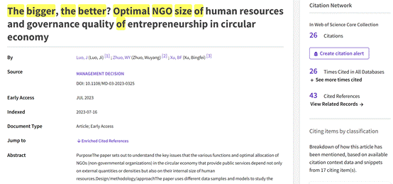 近日,由公司卓武扬教授团队发表在国际顶级SSCI期刊《Management Decision》关于绿色经济的论文---《The bigger, the better? Optimal NGO sizeof human resources and governance quality of entrepreneurship in circulareconomy》---同时成功入选最新一期的ESI热点(1‰)和高被引(1%)论文。本文研究了我国绿色经济下NGO规模与地区治理水平的关系,对于新时期建设美丽中国,以高品质生态环境支撑高质量发展具有理论启发意义。这是公司经济学科第一篇ESI热点和高被引论文,实现了公司人文社科类专业科研发展新的突破。