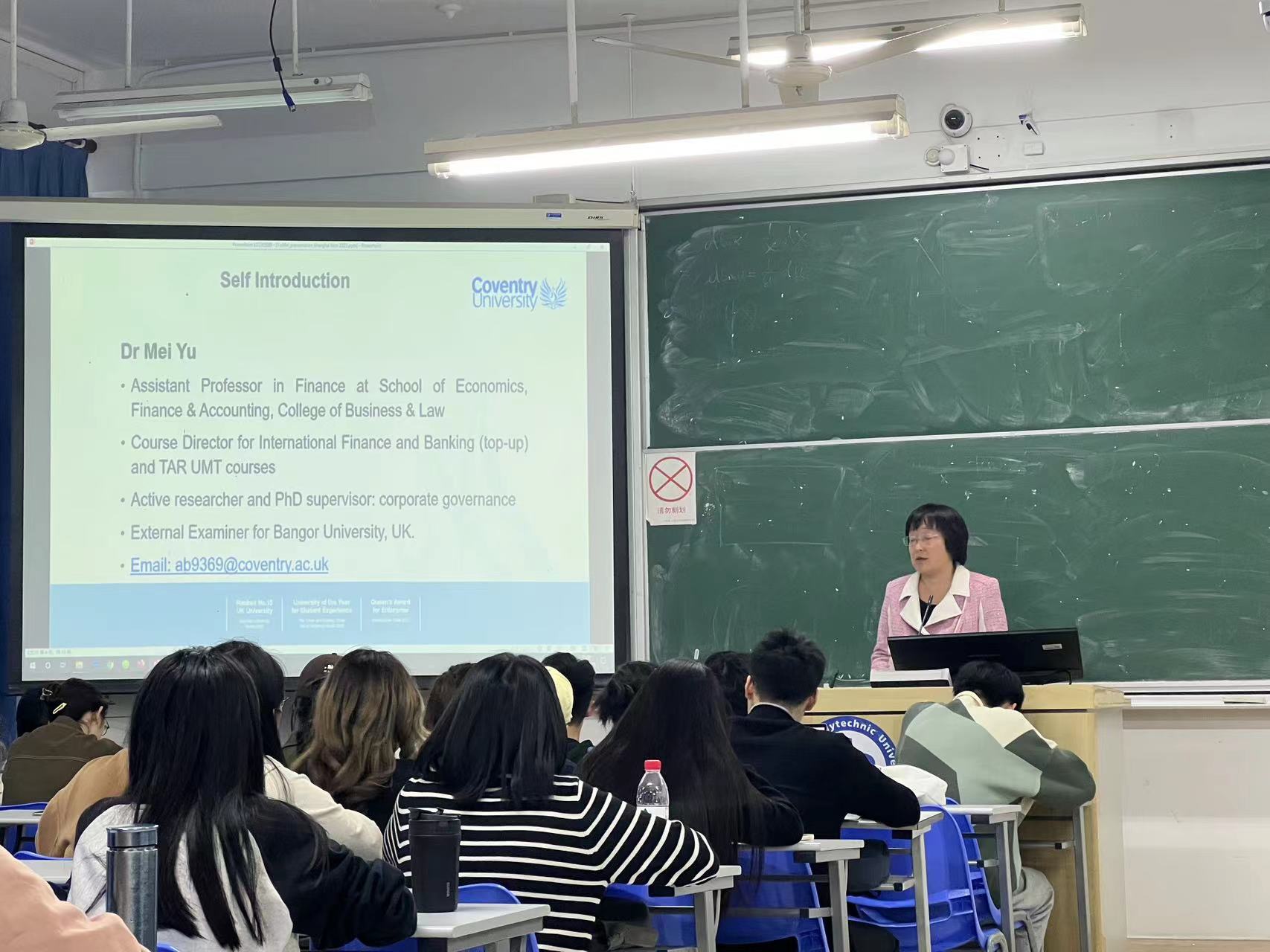 2023年11月8日下午,英国考文垂大学(Coventry University)经济、金融与会计公司、商业与法律公司金融学于梅副教授为公司国际商务专硕研究生开设专题讲座。于梅副教授担任考文垂大学国际金融与银行(专修)课程主任及TAR UMT课程负责人,是该校的博士生导师和英国班戈大学外部考官。