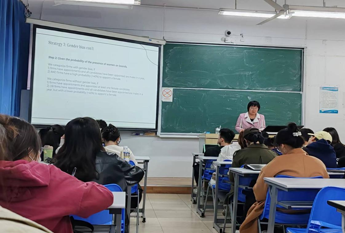 本次讲座的主题是“Gender Diversity,Gender Bias and ESG Performance”,即“性别多样性、性别偏见与ESG绩效”。于梅副教授在讲座中从当今经济热点中的ESG话题出发,结合企业中的性别偏见等问题进行了讲解介绍。讲座采取全英讲授的方式,从“研究的背景”“研究的重要性”“假设方法”“方法论”“初步结果”和“结论”六个方面进行了讲解。通过运用Logit模型分析女性在企业中的歧视问题,更清晰的说明了文章中三者的关联。