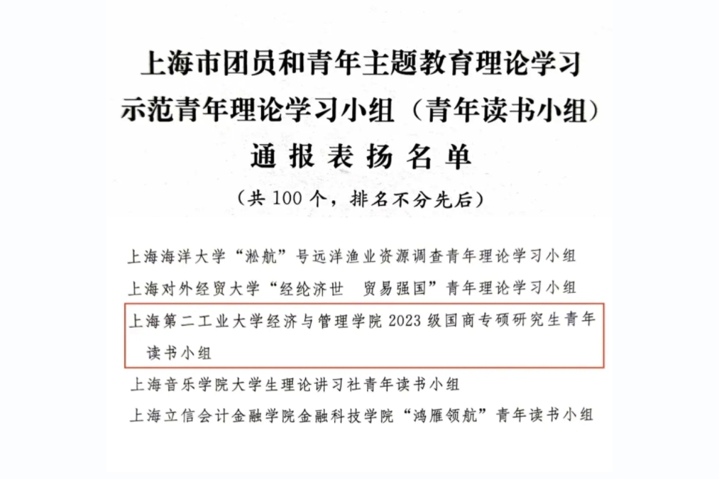 为进一步巩固拓展团员和青年主题教育成果,发挥典型集体和个人的示范引领作用,近日共青团上海市委员会发布了《关于对上海市团员和青年主题教育理论学习典型集体和个人予以通报表扬的决定》,公司2023级国商专硕研究生青年读书小组获团市委通报表扬。