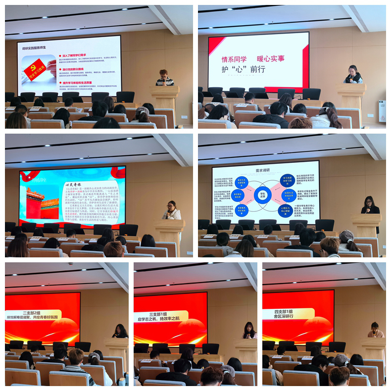 仪式伊始,进入“情系同学,暖心实事”汇报展示环节。培训班七组学员代表依次上台,分享他们在实践活动中的精彩成果与深刻感悟。一支部1组的钟亚君介绍了“携手共筑学习梦”项目,通过多种学习互助形式,助力同学们提升学业成绩;一支部2组程舒文展示的“心灵银幕守护站”,关注同学们的心理健康,以电影赏析等活动为载体,舒缓学习生活压力。二支部1组郭熙豪带来的“六级互助桥,学路并肩跑”,为备战六级英语考试的同学搭建起交流学习的平台;二支部2组王婕汇报的“排忧解难促凝聚,共绘青春好氛围”活动,聚焦于解决同学们在校园生活中的实际困难,增强集体凝聚力。三支部1组陈晓阳的“启学志之帆,扬效率之航”从学习方法与时间管理等方面着手,帮助同学们提高学习效率;三支部2组陈韵伊阐述的护‘心’前行”项目则进一步深化心理健康服务实践;四支部1组王心平展示的“舍区深研行”项目,深入员工宿舍,开展调研与服务,切实改善舍区环境与文化氛围。这些实践项目充分展现了入党积极分子们积极践行党的宗旨,全心全意为同学服务的精神风貌。