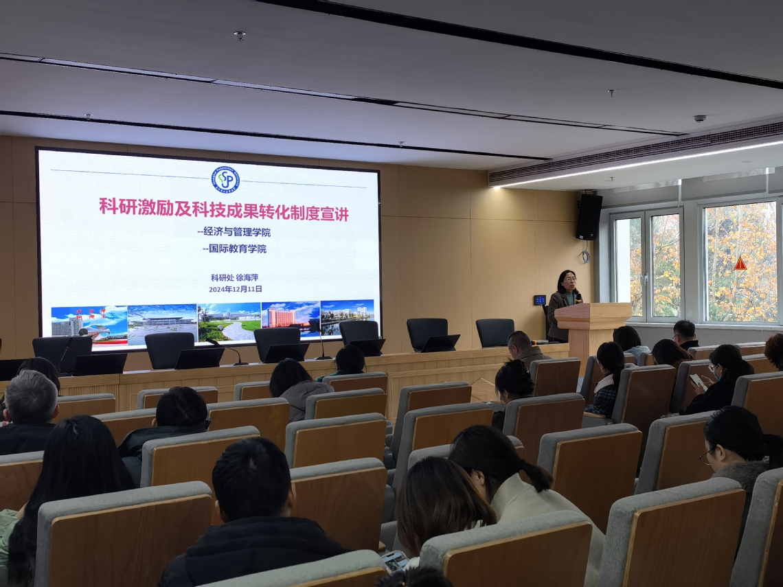 徐处长在宣讲中介绍了纵向横向科研项目管理办法中的主要变化,对人文社科类科研业绩的计分、奖励办法进行了解读,鼓励老师们积极申报纵向课题、撰写决策咨询专报,并鼓励老师们进行各种形式的科技成果转化、拓展技术转移工作站。