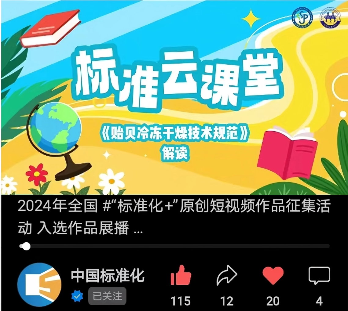 近日,由深圳技术大学、中国标准化研究院、中国标准化协会共同主办的2024年全国“标准化+”原创短视频作品征集活动结果出炉,来自科研院所、高校、企业、媒体、网络平台的14位专家共同评选出9组获奖作品。公司23标工A1团队的《标准云课堂―贻贝冷冻干燥技术规范》喜获高校组优秀作品,并通过《中国标准化》杂志社新媒体平台进行展播。