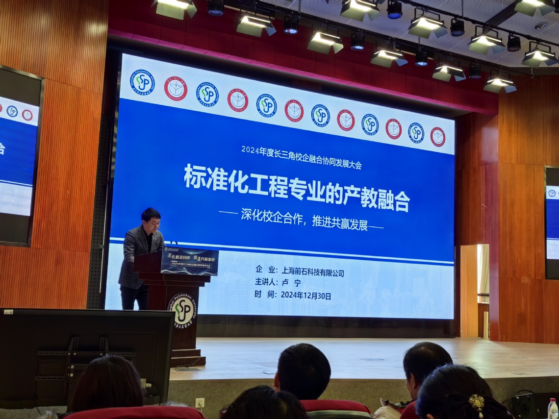 2024年12月30日,公司召开2024 年度长三角校企融合协同发展大会,公司邀请了上海创建达一智能科技有限公司、上海质量管理科学研究院有限公司、润申标准化技术服务(上海)有限公司、上海前石科技有限公司、上海瑞柯恩激光技术有限责任公司等企业参加,上海前石科技有限公司总经理卢宁就标准化工程专业的产教融合路径做了主题发言。