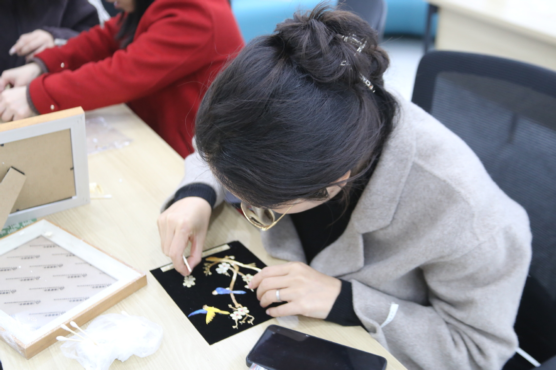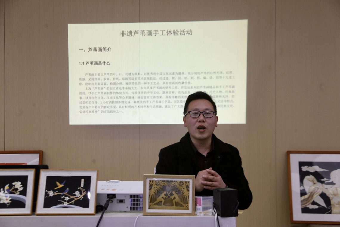 活动现场,非遗项目芦苇画技艺传承人、员工李辉带来芦苇画文化意义介绍和技艺教学。通过展示《梅兰竹菊》传统系列和《秦时明月》创新系列作品,生动阐释了海派芦苇画"以草为媒、化朽为奇"的艺术精髓。"每片芦苇都要经过选材、剖割、熨烫等12道工序",李辉手持特制烙笔现场演示,"温度控制是呈现明暗层次的关键"。