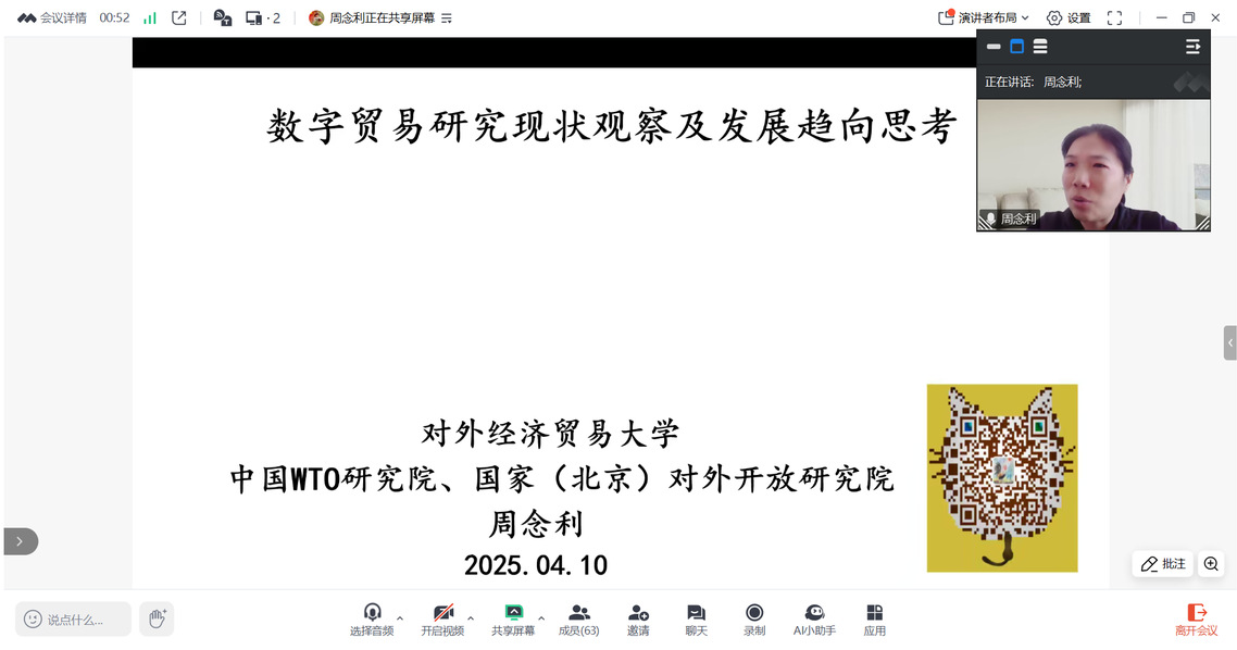 4月10日,对外经济贸易大学中国WTO研究院研究员、博士生导师周念利应邀来公司做线上专题讲座。讲座由科研经理宋小龙主持,公司教师、国际商务专业研究生和部分本科生参会。