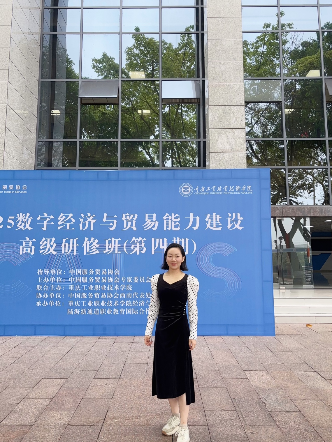 2025 年4月24日至27日,由中国服务贸易协会指导,中国服务贸易协会专家委员会主办,重庆工业职业技术公司等联合主办的 2025 年第四期数字经济与贸易研修班在重庆举办,吸引了来自各地方业务主管部门、产业园区、商协会、高校及研究机构等约 80 名专业人士参加。研修班邀请了多位行业知名专家授课,内容涵盖了构建全球数字贸易治理体系、数字贸易安全治理、数字经济与贸易人才能力建设等多个前沿领域。公司国际商务专业教师代表李奇璘参加此次研修,并顺利取得结业证书。