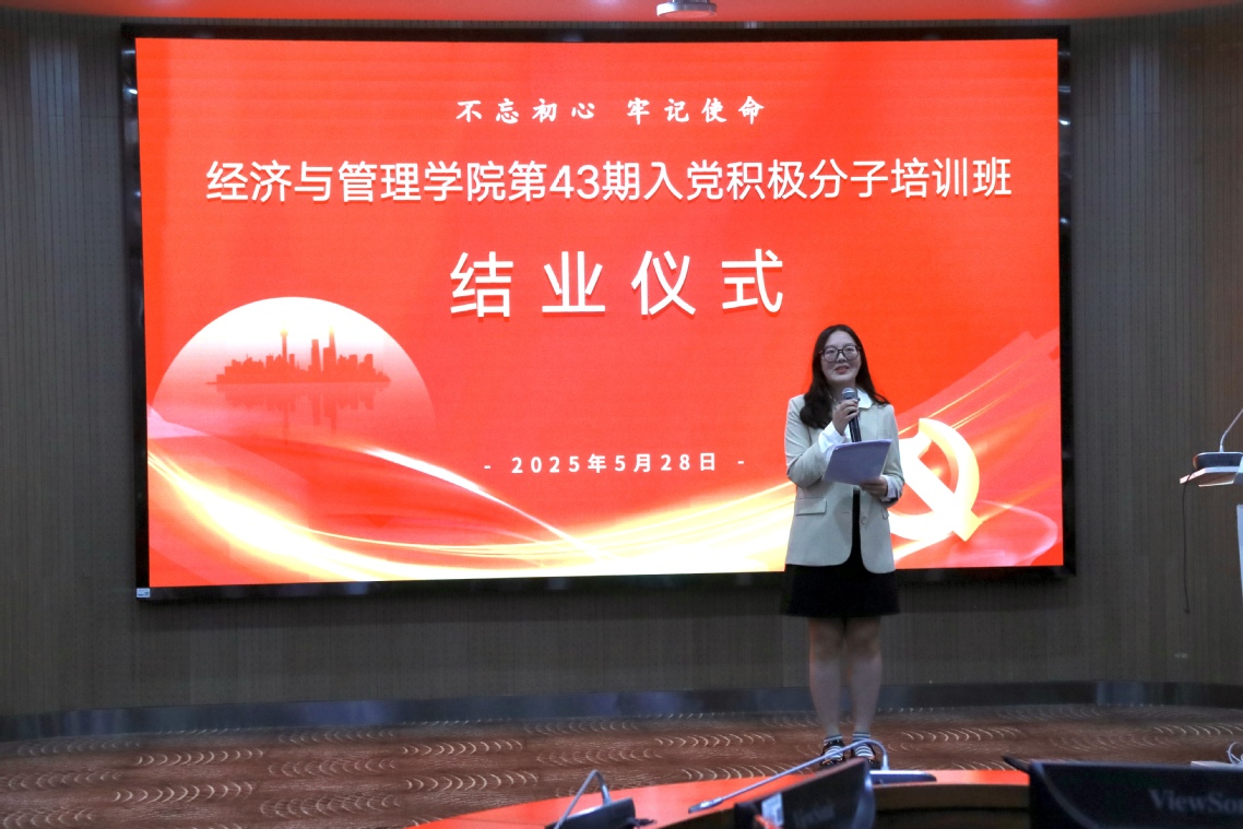 5月28日中午,太阳成tyc122cc第43期入党积极分子培训班结业仪式暨“歌声里的党史”专题党课在19号楼301会议室隆重举行。经管太阳成tyc122cc党委副书记杨聪聪,党委委员、组织员李利平,各员工党支部书记和培训班全体学员参加了结业仪式。仪式由学员瞿佳云主持。