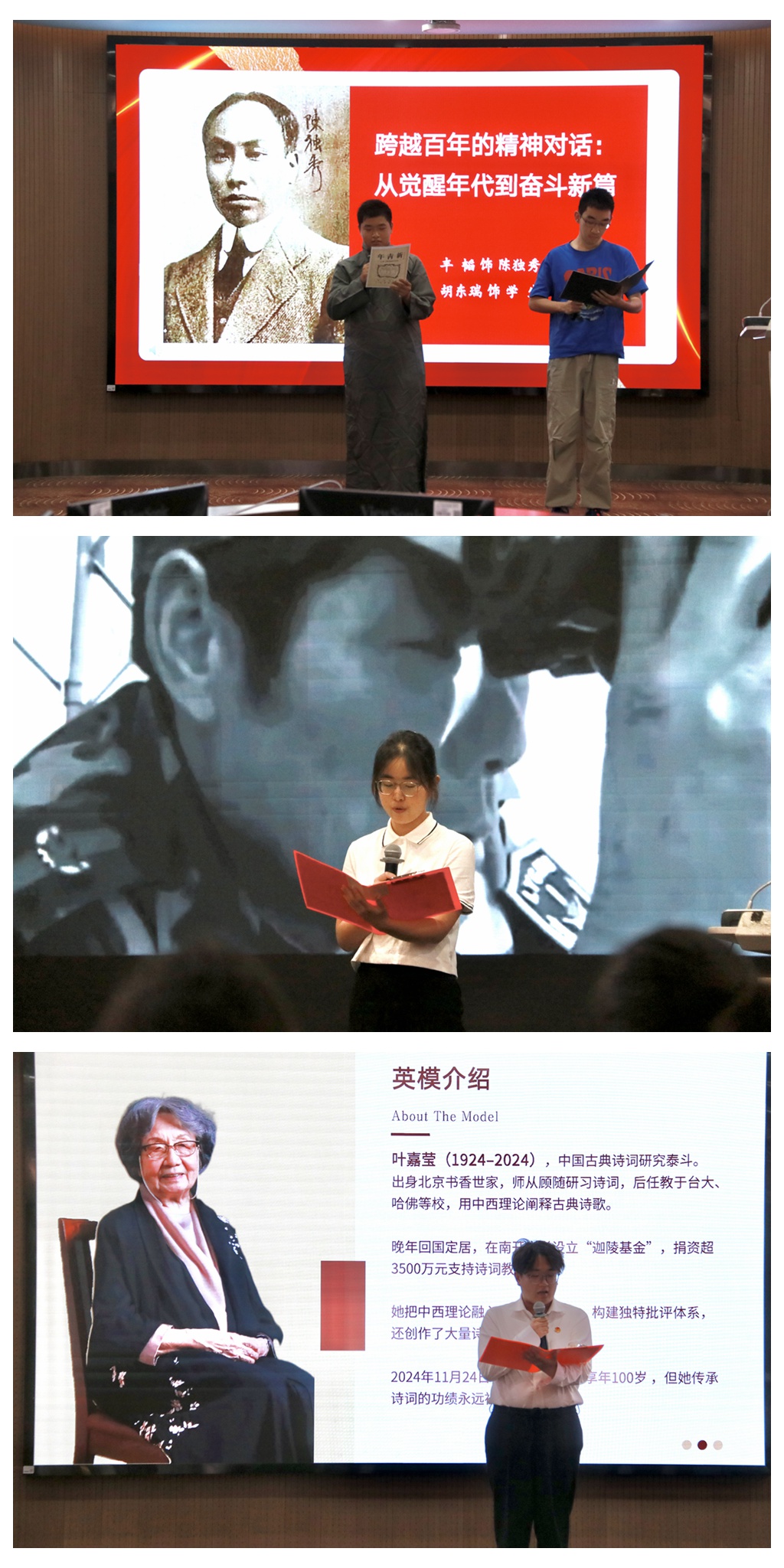 结业仪式在“致英模的一封信”主题朗诵中拉开帷幕。三组学员代表以真挚的情感,向不同领域的英模人物致以敬意。丰韬、胡东瑞带来《觉醒回响:百年青春的双向奔赴》,用激昂的语调重现了百年前青年与时代的热血对话,展现了革命先辈为理想献身的坚定信念。薛慧怡朗诵的《追寻光、成为光、散发光》,以细腻的情感讲述了新时代青年对英模精神的传承与践行,呼吁在场学员在追光路上勇担使命。赵亮的《愿将心事付瑶琴――致诗词守灯人叶嘉莹先生》,则以诗意的语言致敬古典诗词研究泰斗叶嘉莹,诠释了文化传承者的坚守与情怀。
