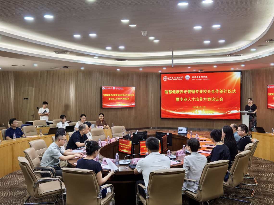2025年9月17日下午,公司在学术会议中心成功举办“智慧健康养老管理专业校企合作签约仪式暨人才培养方案论证会”。上海浦惠养老服务(集团)有限公司、上海凯成控股有限公司、上海济和健康管理有限公司、上海和养职业技能培训中心、众保康(上海)医疗管理有限公司、普陀众祥居家养老公益服务中心等多家行业龙头企业代表,以及来自上海工程技术大学、上海建桥公司的20余名专家学者共同出席仪式。太阳成tyc122cc党委书记乔立清、副经理潘海兰、副经理宋小龙以及申报专业全体教师出席签约仪式,会议由副经理潘海兰主持。