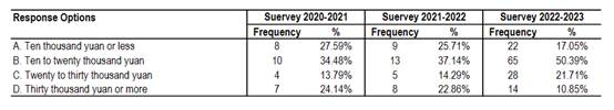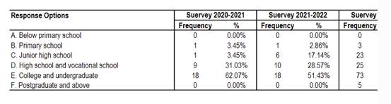 The surveys in 2021, 2022, and 2023 involved 29, 35, 129participants respectively, and included 55 questions covering various aspectssuch as the overall impression of the school, school ethos and academicatmosphere, student management, educational environment, teacher ethics andteaching style, as well as family background. The survey targeted parents ofcurrent students at our school, and the parents took this survey seriously andprovided significant support. All survey questionnaires were collected inAugust 2021, March 2022, January 2023, effectively achieving the objectives ofthe survey. The questionnaire was composed of two main parts. The first partconsisted of family background information, including 12 questions about thestudent's gender, grade, parents' level of education, family annual income, andsoon. The second part focused on parents' satisfaction with various activitiesat the school, comprising 43 questions with five options: very satisfied,satisfied, somewhat satisfied, dissatisfied, and very dissatisfied. Thefollowing will provide a detailed analysis of the questionnaire structure.